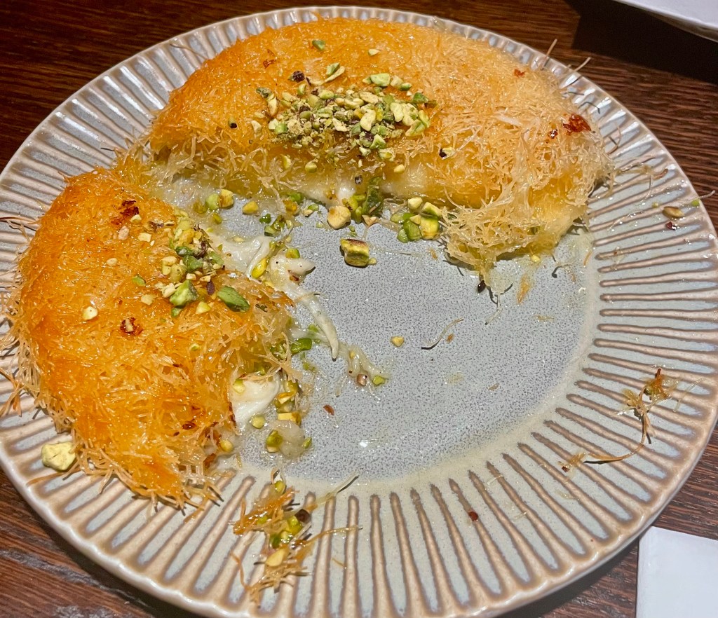 To finish, although I must admit we hardly ate any of it due to being intensely full, we were given Kunafa, which was spun pastry with cheese underneath and covered in syrup and pistachios. I’ve seen this before and always been intrigued by how it tasted, and it was really delicious, but it was so, so sweet, I don’t think even if I hadn’t been full, I would have managed much of it! They did give us a mint tea and a date, though, which was a perfect way to end the meal.